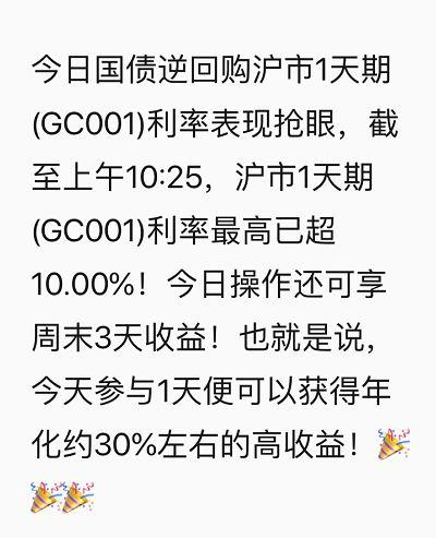 1天期国债逆回购涨幅已翻倍,目前的利率均高达10%左右,算上周末计息3天实际相当于30%。