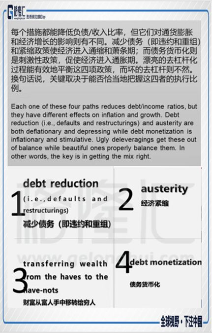 根据达里奥的理论,以上四种去杠杆的措施要根据实际的情况采用不同的量和度来实施。