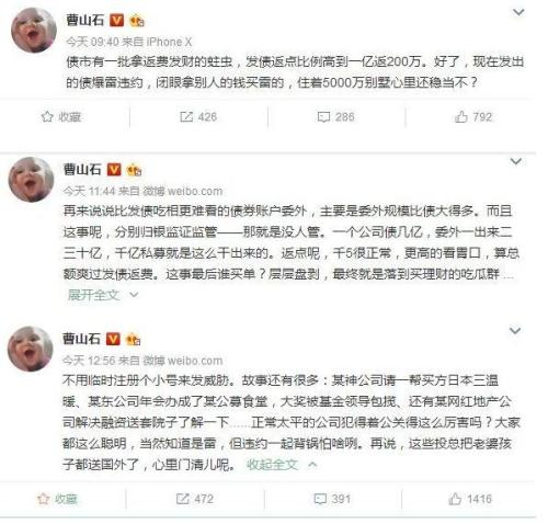 昨天微博上知名财经博主爆料:债市有一批拿返费发财的蛀虫,发债返点比例高到一亿返200万。好了,现在发出的债爆雷违约,闭眼拿别人的钱买雷的,住着5000万别墅心里还稳当不?