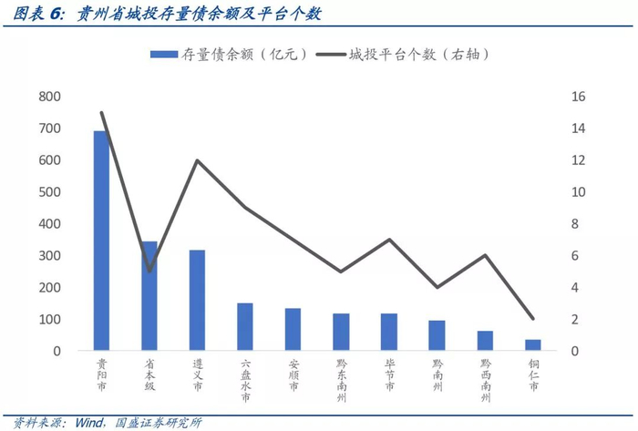 城投平台个数从多到少依次为贵阳市15个、遵义市12个、六盘水市9个、安顺市7个、毕节市7个、黔西南州6个、省本级5个、黔东南州5个、黔南州4个、铜仁市2个。