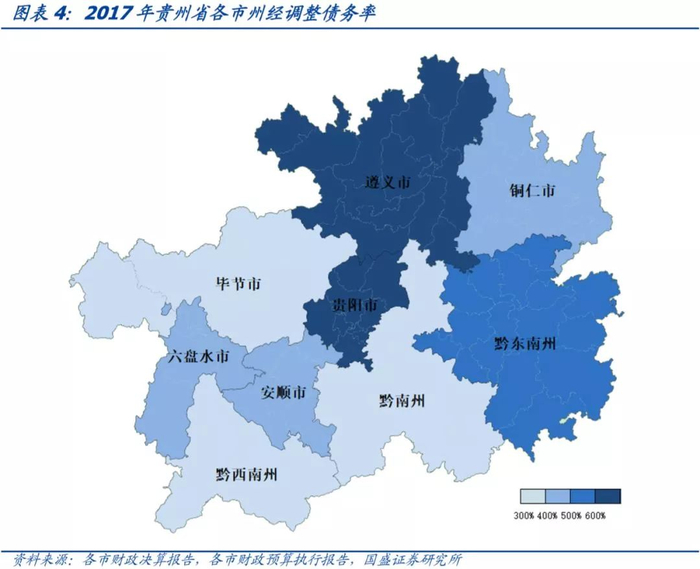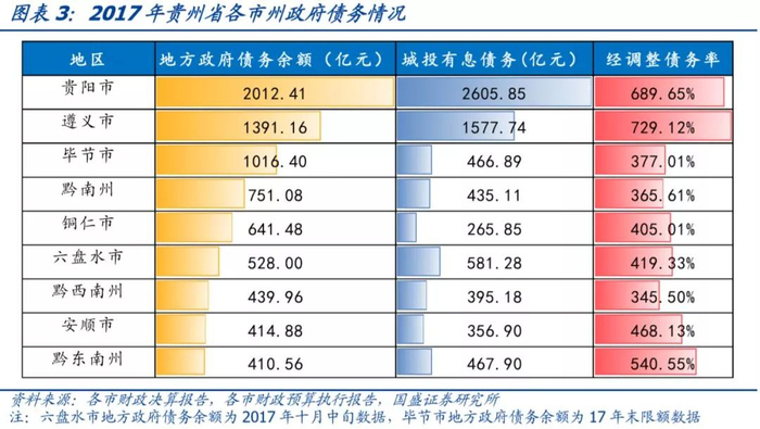 从经济、财政和经调整债务率综合来看,安顺市、黔东南州、铜仁市资质相对较弱,毕节市、黔南州、遵义市和黔西南州处于中游水平,贵阳市、六盘水市资质相对较好。