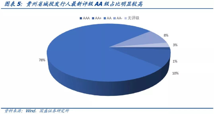 按照Wind口径,在人工剔除明显不是城投平台的公司后进行统计。截至2018年6月30日,贵州省城投平台存量债余额为2064.3亿元,涉及发行人72个。从发行人最新评级来看,AAA级有1个、AA+级有7个、AA级有56个、AA-级有6个、无评级有2个,AA级占比明显较高,为78%。