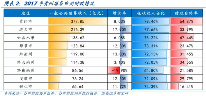 从财政情况看,2017年,一般公共预算收入排名和GDP排名大体一致,只有六盘水和毕节、安顺和铜仁互换位置。其中,贵阳、遵义一般公共预算收入分别为377.9亿元、216.4亿元,远超其余各州市,而铜仁、安顺和黔东南州在100亿元以下。