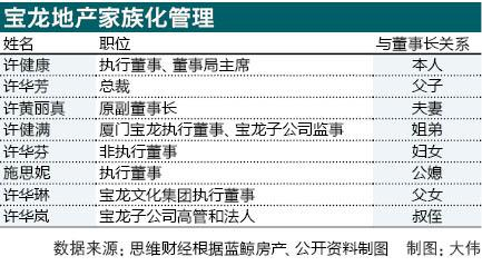 作为典型的家族型企业,宝龙地产给职业经理人留下的发展空间似乎极其有限。公开资料显示,公司董事长许华芳的妻子、姐妹、姑姑、母亲,堂妹均在集团各个岗位担任要职。