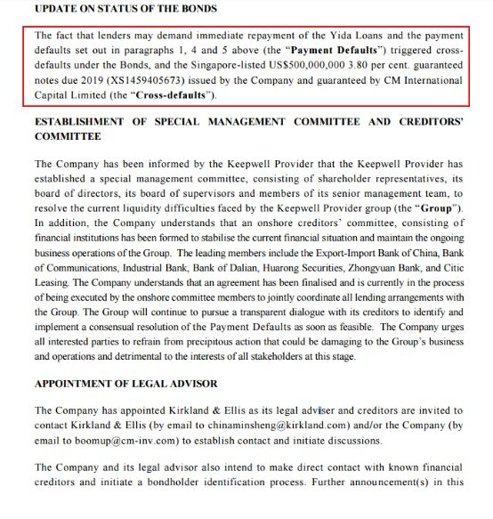 中民投在公告中表示,已经聘请美国凯易律师事务所作为法律顾问,做好美元债投资者沟通工作。