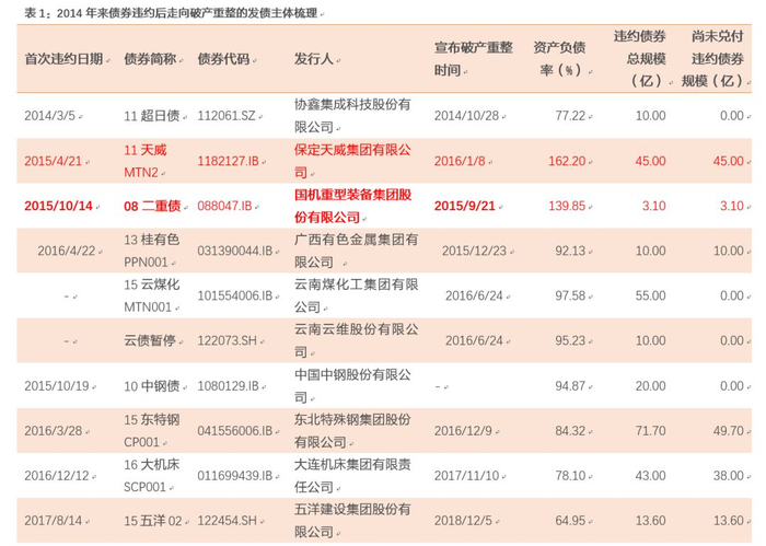 2014年以来,我们共梳理了31个进入破产重整程序的违约债券发行人,除了保定天威集团有限公司、国机重型装备集团股份有限公司、柳州化工股份有限公司、阳光凯迪新能源集团有限公司在破产前最新一期报表超过100%之外,其余均未达到100%。