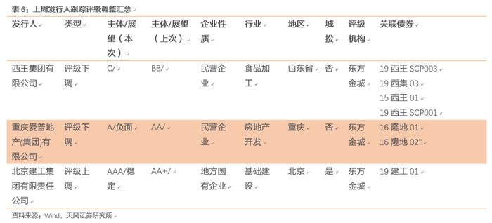 上周2家评级一次性下调超过一级的发行主体:西王集团有限公司、重庆爱普地产(集团)有限公司。