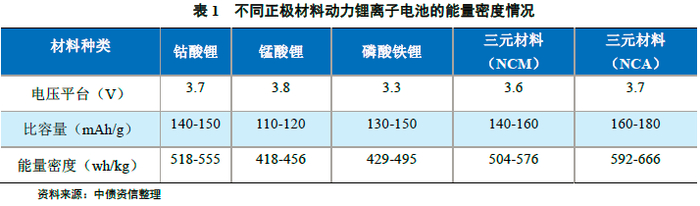 动力锂离子电池的能量密度是下游新能源汽车补贴政策的主要衡量指标,虽然2018年补贴政策不单独考虑该指标且对该指标的要求更高,但在众多指标中,能量密度为实现锂电设备更轻薄、新能源汽车续航更长的核心要素。电池能量密度越大,平均输出电压越高。根据真锂研究数据显示,2017年电池包能量密度在105Wh/kg以下的车辆的锂电装机占比高达50.7%,而能量密度高于160Wh/kg的装机占比为0%,能达到120Wh/kg的1.1倍补贴政策要求的占比超过40%。但根据新的补贴政策,能量密度在120~140Wh/kg之间的补贴倍数仅为1.0倍,未来动力锂离子电池的能量密度将继续提升。动力锂离子电池的能量密度由正、负极材料的选择、电池的结构及生产工艺等因素影响。