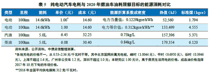 以纯电动乘用车和传统燃油乘用车为例,对比两者单位里程的直接能源输入,初步分析纯电动乘用车与燃油乘用车的能源消耗水平。国务院发布《节能与新能源汽车产业发展规划(2012-2020年)》设定,2020年乘用车新车平均燃料消耗量达到5.0L/100km;而目前大多数乘用车的实际使用油耗高于此目标值。作为对比,本研究前述统计中纯电动乘用车能耗中位数为14.6kWh/100km。以纯电动乘用车的当前平均表现技术数值,对比2020年新车的目标油耗值,可以看出,纯电动乘用车的节能效应明显。以热当量对比的热值,纯电动乘用车能耗仅为燃油车能耗的29.3%~33.4%;如考察火力发电的热消耗,以等价值计算,纯电动乘用车也比燃油车的能耗低12~15%。同时,不考虑充电与加油的便利程度,若仅考察燃油和充电的物价,充电的直接能源使用成本亦明显低于燃油。具体对比如表8所示。因而从能源使用的角度看,纯电动乘用车确实有明显的节能效益。