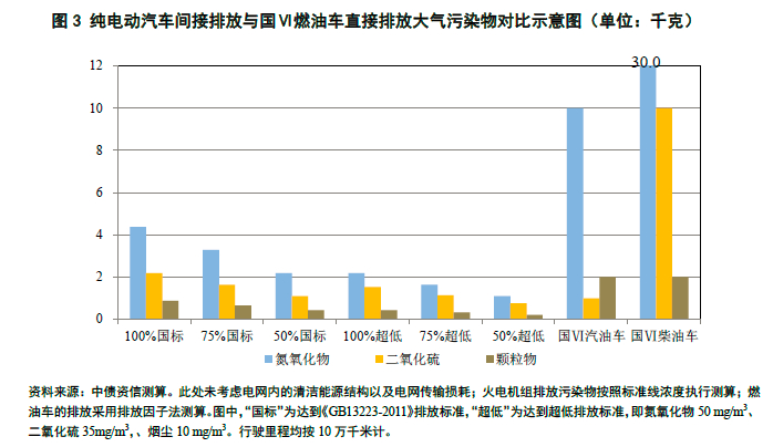 若考虑纯电动汽车的间接排放,则需要考察城市所处的电网的上网能源结构。我国基本上仍以火电为主,2016年我国火电发电量占全部的74.36%。在火电占主体的电力生产环节中仍有大气污染物排放,但火电厂集中处理大气污染物的有效程度,通常优于传统燃油车分散使用三元催化器等尾气处理方式。