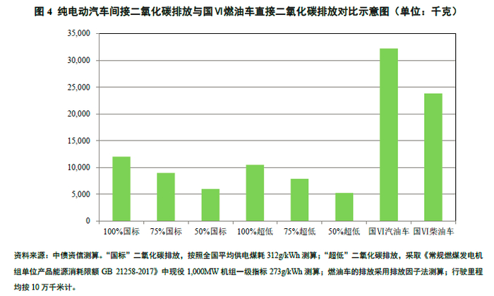 从温室气体排放的角度测算,火电机组分别按照2016年全国供电煤耗312g/kWh和最新国家标准《常规燃煤发电机组单位产品能源消耗限额GB 21258-2017》中现役1,000MW机组一级指标273g/kWh进行测算。纯电动汽车的二氧化碳间接排放,亦显著低于燃油车辆的直接排放,这与火电厂能源利用效率高于普通车辆的燃油发动机有关,而柴油车比汽油车更高的热效率也反映在柴油车更低的二氧化碳排放水平上。