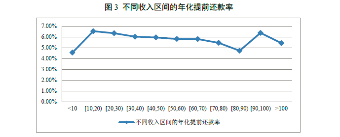 从图3可以看出,年收入在10万元以下的借款人提前还款率最低,而在其他收入区间基本上保持相对稳定的水平,并没有呈现出明显的相关性。事实上,因为针对不同收入区间的借款人,银行的授信额度通常具有一定的差异性,对于收入较高的借款人可能对应的贷款合同金额也更大,所以其提前还款能力未必会更高。因此,提前还款率与借款人收入不存在直接的线性关系。