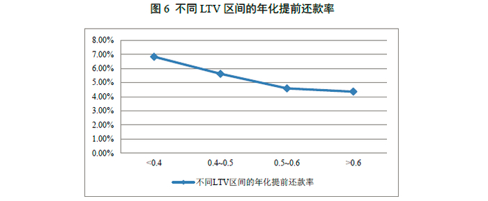 从房价对贷款余额的覆盖倍数来看,贷款价值比LTV(贷款价值比=合同金额/房屋价值)的大小可以很好的体现房屋价值与贷款金额之间的相对关系(见图6)。从图中可以看出显著的变化特征,即LTV越小的贷款,房价对贷款余额的覆盖倍数越高,其提前还款率越高,而随着LTV的增大,提前还款率呈现下降的趋势。事实上,LTV仅为贷款发放时的时点值,随着贷款的不断偿还,房屋价值对贷款余额的覆盖程度还将进一步扩大。