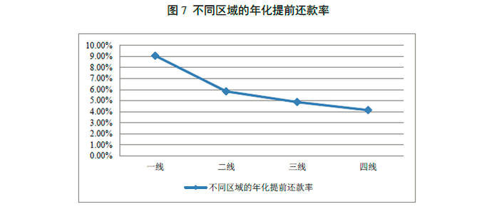 考虑到数据的局限性,我们以城市等级[2]作为房地产市场活跃度的衡量指标,对提前还款的差异作进一步的验证分析(见图7)。其中,对于一二线城市而言,房价涨幅更大,房地产市场活跃度更高,房价保值增值能力更强,相应的借款人二套房需求(投资需求)及换房需求会更高,因而体现在提前还款方面也会更高,相较而言,三四线城市的投资或换房需求较低,提前还款率也较低。