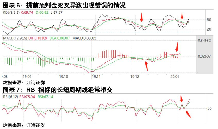 (3)提前预判金死叉很可能出错。以1月7日的预测为例,KDJ指标的K线显示即将向上突破D线,如果按照这种思路去判断,那么显然次日的K线再次背离D线,臆想中的金叉则会导致预测失误。再比如MACD曲线中的短周期线多次与长周期线接触反弹,想象中的向上突破和向下跌破都没有发生。而MACD的失误似乎不能通过结合量的变化去规避,历史数据显示长周期线和短周期线交叉的点没有必然的高成交或低成交量发生,因此尽量在出现金死叉后进行信号判断相对更优。此外,RSI指标的例子也说明存在一些指标经常出现长短周期线的交叉,这和指标的计算方式有关。判断RSI需要加入超买超卖的逻辑。