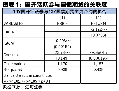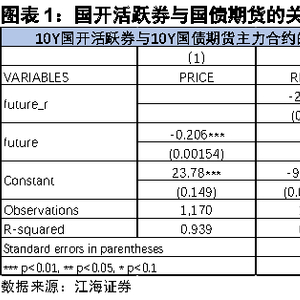首先国债期货本身作为一种金融期货,成交量波动与价格走势与其投资者行为和投资策略相关,包括套期保值、期现套利、基差交易以及投机,不同的交易对手方共同构成了期货市场的行情。而期货行情与现货行情的高频联动性如何?为了验证国债期货的有效性,我们首先对十年国开活跃券价格与十年国债期货主力合约价格进行拟合回归,下图所呈现的是利用Stata对2010年至今的日度交易数据回归的结果。结果显示,(1)价格层面:10年国开活跃券和10年国债期货主力合约之间存在高拟合度,简单用相关性系数97%也可佐证;(2)涨跌幅层面:两者每日涨跌幅的拟合度大大降低。综合来看,10年国开活跃券和10年国债期货主力合约的日度走势是一致的,但在涨跌幅度上两者的关联度不大。其次,受限于日内分时数据的获取,我们无法从实证方法上获得有效性的验证,但从日内盯盘感受来看,分时现券利率走势和国债期货行情绝大多数情况是联动的,关于日内分时的内容后续研究再做具体补充。