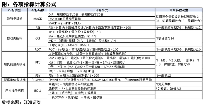 (2)“趋势中”的行情需要归入“中性”。由于技术指标是基于每天的收盘价格计算得到的,本质上则属于滞后数据,叠加日度的判断相对高频,判断“买卖”的尺度和原则很容易受到当天行情的影响,因此很多时候指标的曲线形态客观上看处于趋势中,即没有超买超卖的信号,但是略有向上或者向下的趋势,再结合放量缩量的判断,会很容易把它归入“买卖”情形中。而日度跟踪则需要保持统一的原则和标准,严格遵循判断规则去做判断,客观地筛选“中性”指标。
