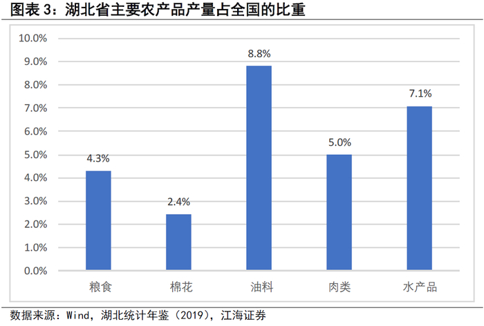 分产业来看,疫情对农业生产影响有限,但对农产品供应可能带来一定影响。湖北省自古以来便是鱼米之乡,气候湿润,境内河湖众多,有“千湖之省”的美誉,是国内重要的油料作物和水产品产地。我们以2018年数据为例,湖北省油料、水产品、肉类、粮食和棉花的产量分别占到全国的8.8%、7.1%、5.0%、4.3%和2.4%。从疫情对产业的影响看,由于此次新冠肺炎疫情发生在春节前后,气温较低,并不是传统意义上的农忙时节,只要疫情的影响不延续至春耕季及油菜籽收获季,新冠肺炎疫情对2020年湖北农业生产的影响就相对较为有限。