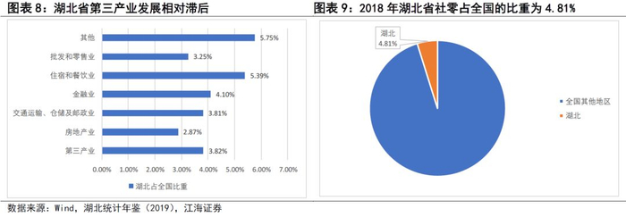 湖北呈现出明显的第三产业发展相对滞后特征。从三大产业的角度看,我们以2018年(2019年数据尚未公布)数据为例,不难发现湖北省产业结构数据呈现出明显的第三产业发展相对滞后特征。2018年湖北省第一和第二产业对GDP的贡献率分别比全国整体水平高2和3.7个百分点,第三产业对GDP的贡献率则比全国整体水平低5.7个百分点。从湖北省三大产业GDP占全国的比重来看也能够得到同样的结论,2018年湖北省三大产业GDP占全国的比重分别为5.5%,4.7%和4%,而同期湖北省GDP占全国GDP的比重为4.4%,第三产业发展滞后且低于全国平均水平的问题明显。