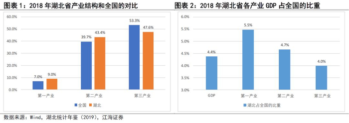 从产业结构分析的角度入手,最为普遍和常见的方法就是借助生产法GDP的统计口径,从三大产业的角度来进行分析。本文就将采取这一方法,分别从湖北自身的产业结构和湖北各大产业对全国的影响两个维度,对疫情对湖北经济数据的影响,以及湖北经济数据对全国数据的潜在影响展开分析。