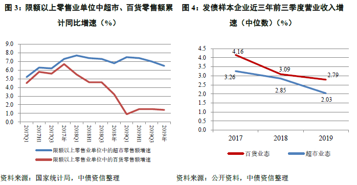 综合历史数据和近年来超市业态发展状况,我们认为以必选消费为主的超市业态消费属性偏刚性,抗周期性和风险事件的能力较强,短期受疫情冲击较小,行业销售额和样本企业收入增速或均仅呈现微幅下滑。具体营业额增速来看,预计2020年限额以上零售业单位中的超市零售额增速维持小幅下滑态势,但增速水平仍有望在6.0%以上;根据发债样本企业营业收入近三年前三季度增速变动、前三季度收入占全年收入的比重(74.59%)以及2017~2018年全年2.34%和1.75%的增速推测,2019年全年在1.15%左右,2020年发债样本企业收入增速预计在1.00%~1.5%。