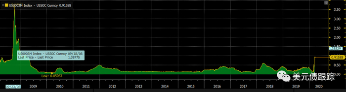 在金融危机之前,无抵押拆借市场是离岸美元短期融资的主要方式。曾经被称为“金融市场上最重要利率”的美元Libor,就是这个市场的价格基准。这个市场由无风险利率和信用利差组成。当美元流动性充裕时,这个利差一般不超过20bp。金融危机期间,信用利差骤然扩大,这个市场及其主要风向指标3个月Libor-OIS spread(Libor利率与隔夜指数掉期的利差,值越高代表无抵押拆借市场越紧张,该指标往往也被作为金融危机的先兆)的波动都有相当大的增加,08年金融危机期间,该值曾经达到364bp。最近的流动性紧张中,这个指标逐日攀升,现在已经快到100bp了。