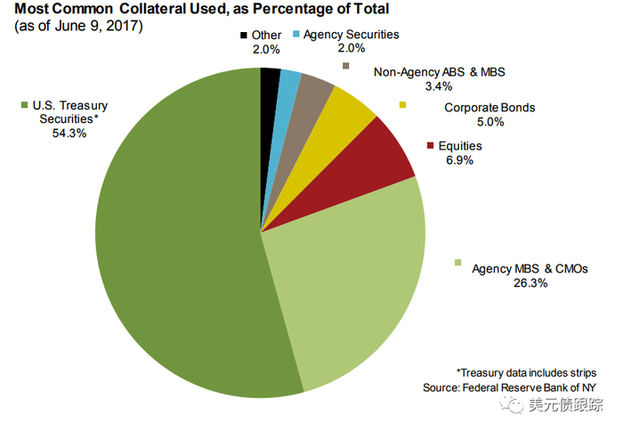 回购市场的体量很大。据统计,美国的回购市场周转量占全球回顾市场的一半以上,每日交易量大约有7000-10000亿美元,体量大同时也意味着流动性好,下图是这个市场中抵押品的构成比例,从这个比例来看,美国国债占整个回购市场的54.3%,其他例如MBS、CMOs、Equities、Corporate Bonds,Non-Agency ABS&MBS分别占比26.3%、6.9%、5.0%和3.4%。国债是回购市场占比最大抵押品。