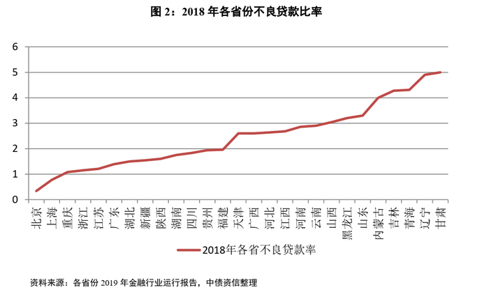 同全国范围的走势相似,上述三个指标在同一区域内呈现相似的关系。从经营范围来看,除少数全国性融资担保公司之外,多数融资担保公司为区域性的,主要业务是为所在区域的中小企业、三农等提供融资担保业务,其代偿风险与所在区域经济及融资环境密切相关。考虑银行不良贷款率是所在区域信用风险的直接反映,因而该指标可在一定程度上反映区域性融资担保公司所面临的代偿风险,导致融资担保业务风险呈现出区域分化。从2018年各省份银行贷款不良率情况来看(见图2),东北、西南、西北以及华北(主要是山东、山西)等地区的不良贷款率处于行业较高水平,因而以上地区融资担保行业的代偿风险需重点关注。