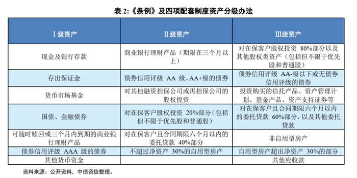其次,为了提高资金利用效率,融资担保公司往往将其用于投资类业务,以提高整体资本回报率。但由于融资担保公司实际发生代偿时,其代偿能力体现在资产的可动用规模以及流动性等方面,因此,资产保持一定的流动性至关重要。为规范融资担保公司的投资行为,以保障其代偿能力,最新监管条例对于融资担保公司的资产进行了三级分类(融资担保公司的投资业务将在后文集中分析)。融资担保公司的资产投向比例需符合监管要求。
