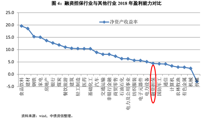 根据上文分析,担保公司单纯从事融资担保业务基本无法实现盈利,因而通常会运用资本金或外部融资进行对外投资来增厚收益。从中债资信样本数据来看,2018年融资担保行业净资产收益率的中位数4.4%,与其他行业相比盈利水平较低。从图4来看,与中信证券29个行业分类相比,融资担保行业盈利能力排名偏后;与非银行金融行业相比,其盈利能力同样处于较差水平。从企业间的分化来看(见图5),全国性融资担保公司以及部分市场化程度高的地方融资担保公司由于担保放大倍数较高,且在投资方面具备相对较强的专业性,整体盈利能力较强;而多数地方性融资担保公司担保放大倍数较低,且投资专业性较弱,投资收益率较低,导致整体盈利能力较弱。