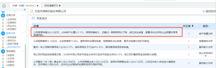 中债一站通财务风险分析功能针对2018年天神娱乐财务数据,提示主体商誉规模较大,存在减值风险。(图片来源:中债一站通)
