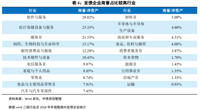 其次,将商誉占比水平与同行业内企业进行横向对比,若明显高于行业水平,则需重点分析商誉形成的原因及其价值合理性。根据中债资信对信用债市场非金融企业发债主体的商誉/净资产的统计,发债行业中软件与服务、医疗保健设备与服务、媒体、制药、生物科技与生命科学、耐用消费品与服装、技术硬件与设备行业的商誉/净资产的行业均值均超过10%,处于较高水平,其他行业商誉/净资产小于10%。