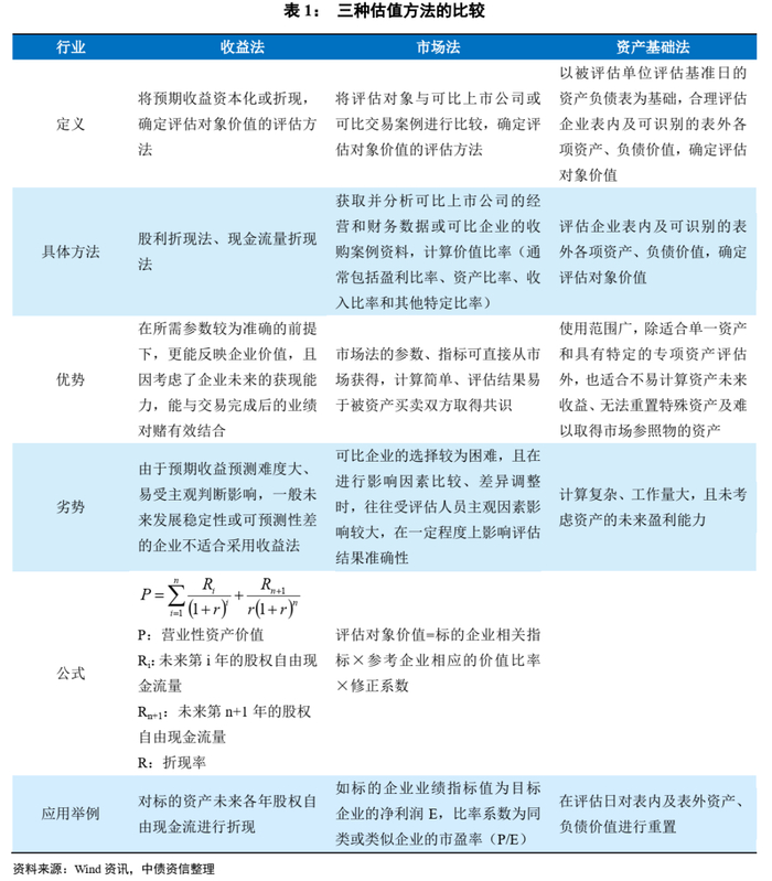 在并购实务中,国内上市公司并购重组中股权类资产评估方法以收益法和资产基础法为主,其中采用收益法的占比最高,根据历史统计数据,选择收益法的占比约60%,采用资产基础法的比例约25%,选择市场法的占比仅约7%。三种方法相比,收益法的估值溢价倍数[1]最高,根据历史统计数据,收益法的溢价倍数平均达2倍以上,其他方法均不足1倍。为保护投资者权益,防止控股股东通过收购时虚增标的资产价值,《上市公司重大重组管理办法》规定,若采取收益法等基于未来收益预期的估值方法对拟购买资产进行评估并作为定价参考依据的,当交易对手为上市公司控股股东、实际控制人或其控制的关联人的,交易对方应当与上市公司签订明确可行的业绩补偿协议。