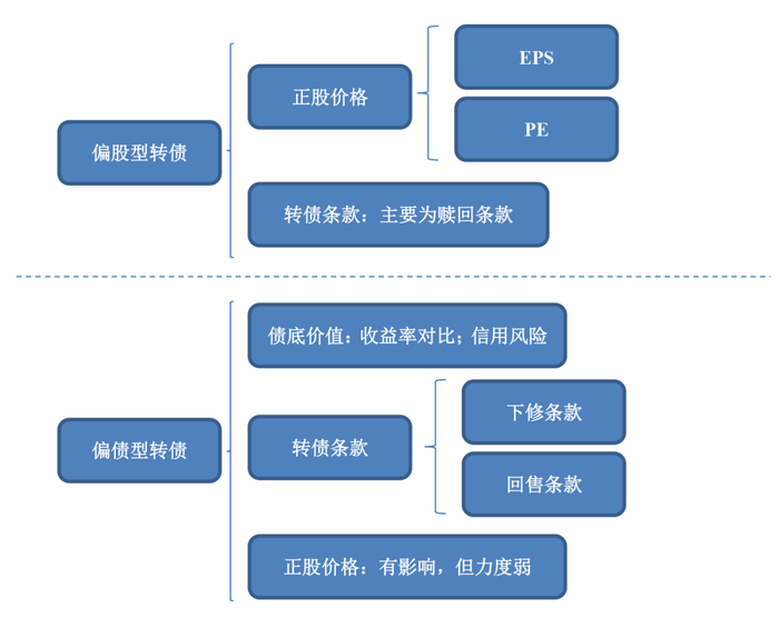 总体而言,发行主体的基本面仍是判断转债价值的重要因素。高价转债的转股溢价率较低,纯债溢价率较高,转债价格距离债底价值较远,转债价格走势几乎取决于正股价格的走势;当转债价格低位时,债底价值分析变得尤为重要。条款方面,博弈下修条款可以获得一定的超额收益,当越接近回售期,进行转股价下修的可能性越大,回售和赎回条款进度也需重点关注。