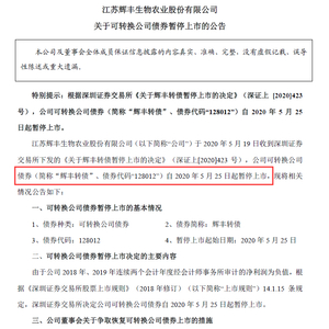 5月19日,辉丰股份公告称,由于2018年、2019年连续两个会计年度经审计的净利润为负值,深交所决定辉丰转债5月25日起暂停上市。