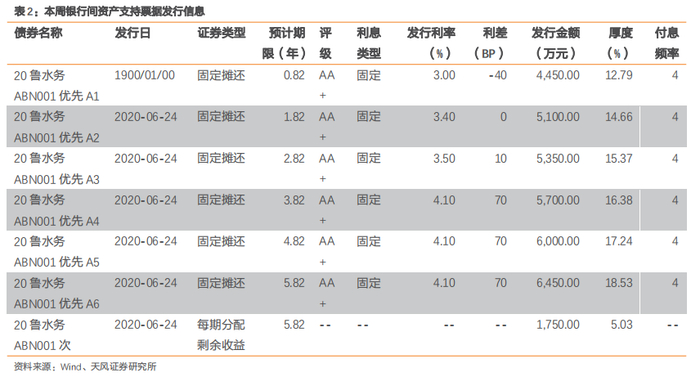 20鲁水务ABN001优先A1、优先A2、优先A3、优先A4、优先A5、优先A6的发行利率分别为3.0%、3.4%、3.5%、4.1%、4.1%、4.1%,与可比短融中票利差分别为-40bp、0bp、10bp、70bp、70bp、70bp。