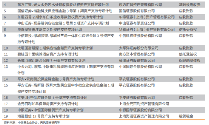 本周共有19期资产支持专项计划在基金业协会备案,本次备案产品中,基础资产包括应收账款、企业债权、信托受益权、基础设施收费、租赁租金和保理融资债权。