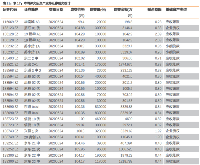 本周深交所资产支持证券成交1194.7万份,成交金额12.15亿元。成交个券基础资产包括应收账款、小额贷款、企业债权、不动产投资信托REITs。