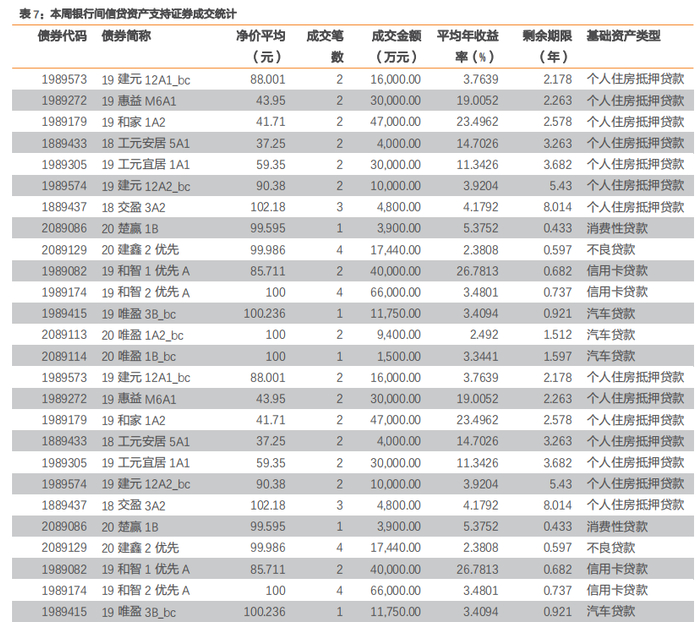 本周银行间信贷资产支持证券成交90笔,成交金额87.54亿元,基础资产包括汽车贷款、个人住房抵押贷款、消费性贷款、不良贷款、信用卡贷款。