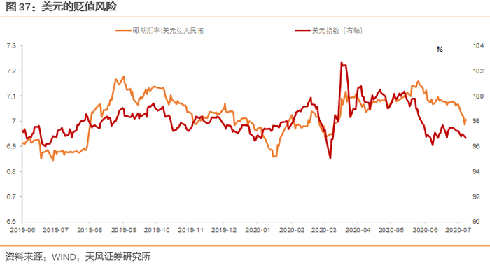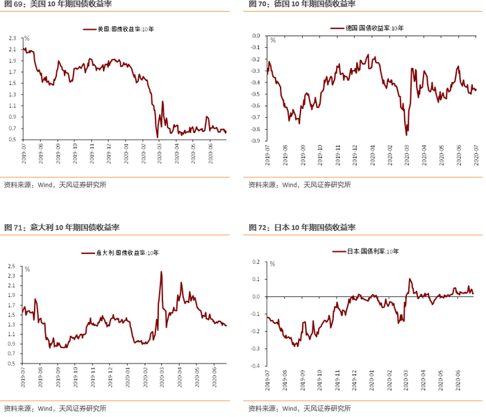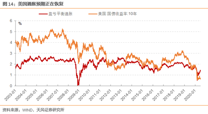 随着政策落地,美国的通胀预期正在恢复,从危机时期3月中旬,美国TIPS债券隐含的通胀预期仅有0.5%,到现在通胀预期是1.39%,而与此同时,美债收益率仅在0.6%-0.9%的范围内波动,说明市场存在一定的通胀预期,但是并没有在长端中反应出来。