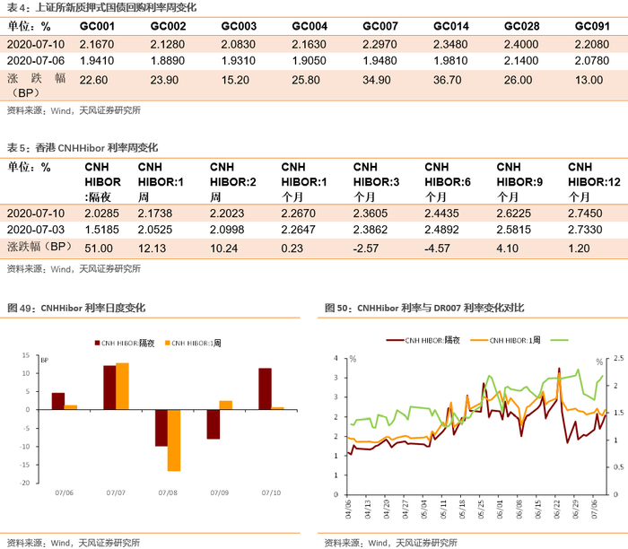 本周央行未开展逆回购操作,全周净回笼2900亿,资金面先紧后松。银行间隔夜回购利率上行81BP至2.17%,7天回购利率上行38BP至2.21%;上交所质押式回购GC001上行23BP至2.17%;香港CNHHibor隔夜利率上行18BP至1.52%;香港CNH Hibor7天利率下行11BP至2.05%。
