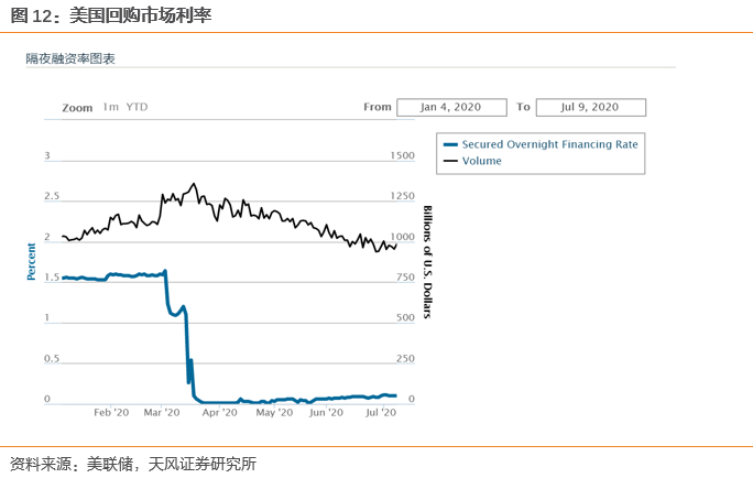在流动性危机过后,美国回购融资利率持续下行,资金市场宽松。3个月和2年的短端利率随着政策利率的下调降至0.2%左右。