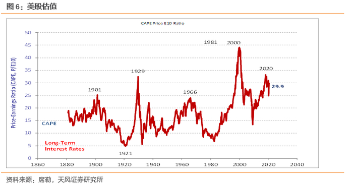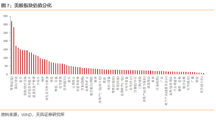 美股风格也演化到了极致,成长优于价值的相对表现达到了科网危机以来的高位。按照CAPE,美股估值在29.9倍,处在历史高位,分板块来看,美股估值高度分化,科技、零售等板块获得较高估值,周期等传统行业估值较低。