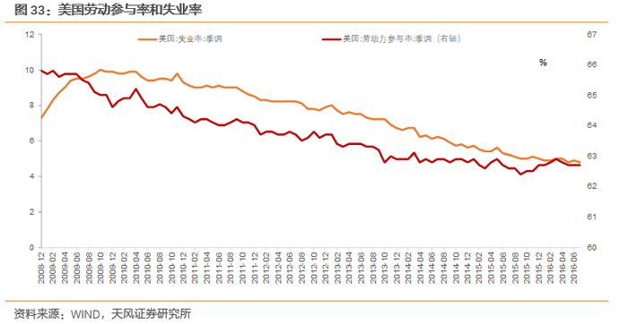 美联储实际上政策主要锚定于劳动力市场的复苏。自2009年后,美国失业率持续下降,劳动力市场改善,但与此同时劳动参与率也持续下行,表明退出劳动力市场的人数也在持续增加,就业市场并未真正稳定,直到2013年美国劳动参与率开始稳定,这也给了美联储鹰派表态的基础。