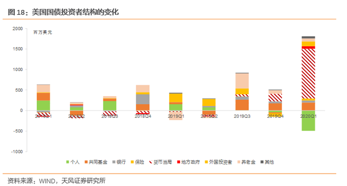 疫情发生后,美联储资产负债表规模从4万亿美元跃升至7万亿美元。很大一部分直接购买国债:2020年Q1的新增国债中,美联储购买了其中的92.6%,个人投资者大幅减持,其他投资主体的增持数量也要小于此前水平。