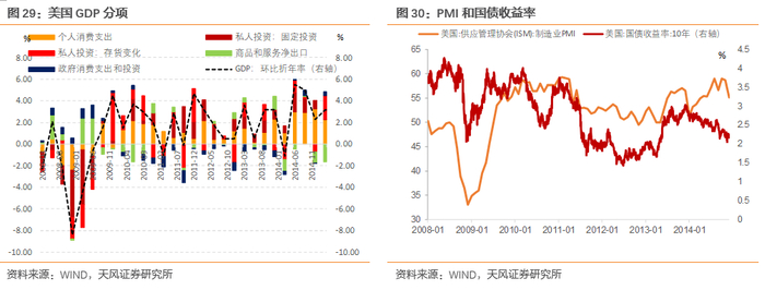 对应美国经济的弱复苏,美联储的流动性支持是贯穿2011年-2013年的。资产负债表的扩张压低了国债的期限溢价,导致美债收益率持续下降。流动性的外溢同时推高美股,美国股债在此期间都走出长期的牛市。