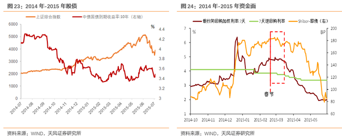 流动性充裕的状态下,2014年-2015年中国资本市场逐步进入权益牛市格局,在股价快速上涨时期(3000点以上),债市持续横盘震荡,并且在2014年12月、2015年2月、5月都出现利率显著上升的现象。