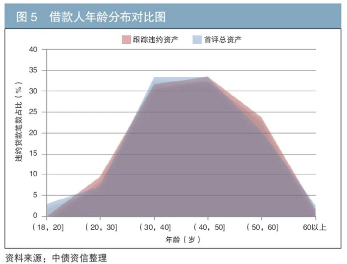 由借款人的年龄分布对比图可见,跟踪违约资产和首评总资产所涉及的借款人年龄分布形态大体一致,但20~30岁、50岁以上的借款人,其贷款违约笔数占比较其在首评总资产中的占比有所上升。而从30~50岁的借款人来看,其贷款违约笔数占比较其在首评总资产中的占比低,说明中青年借款人多处于职业的稳定期,财务状况较好且稳定,偿债能力较强,发生违约的风险更低(见图5)。