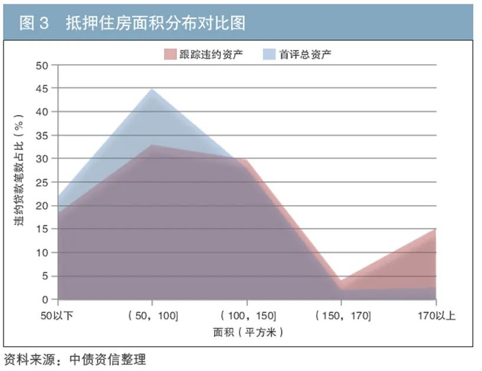 从抵押住房面积分布对比图中来看,当抵押住房面积大于100平方米时,违约贷款笔数占比较大。对于购买大户型住房的借款人来说,其贷款还本付息金额较大,加大了购房者的财务负担。一旦借款人的第一还款来源(一般为收入)受到影响,那么其偿债能力将下降,这将导致贷款违约的可能性增大(见图3)。