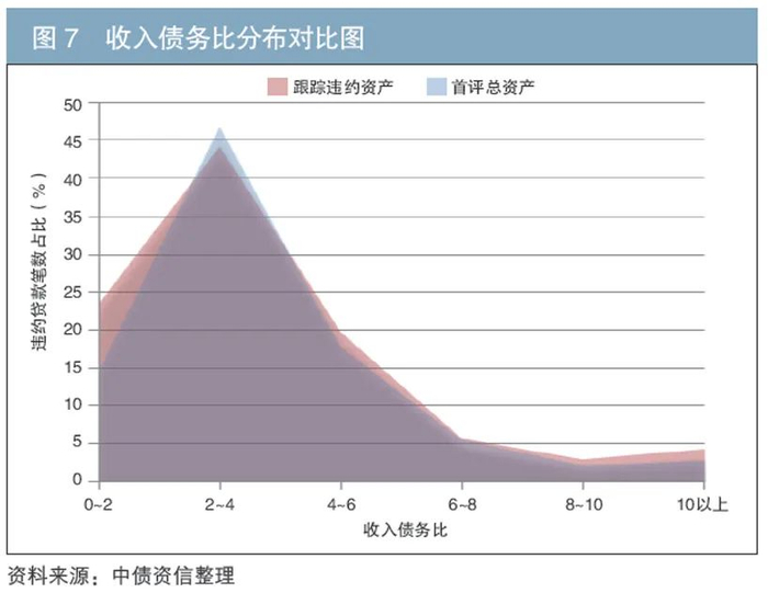 收入债务比是指借款人的收入水平对贷款额的覆盖程度。从收入债务比分布对比图来看,在相同的收入债务比条件下,样本贷款的违约笔数占比与其在首评总资产中的占比较为相似,但是在收入债务比小于2时,违约贷款笔数占比明显增加(见图7)。这说明收入债务比越高,收入对于债务的覆盖能力越强,借款人的相对偿债能力越强,其发生违约的风险越低。